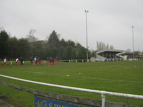 Greens Meadow is situated to the north of Stowmarket town centre, and is quite a decent set-up for the level of football, although certainly not easy on the eye for the most part. Spectators enter through a turnstile hut by the half way line, to the right of which is a grey all-seater stand, and to the left is a covered standing area rather more attractively painted in club colours, with some seats placed along the top step, and towards the corner is a large clubhouse with tea bar serving hatch to the front as well as some tables and chairs. The "media centre" is placed behind the corner flag, a small wooden shed where the team line-ups could be found, and around the rest of the ground there is just hard standing, although spectators are some considerable distance away from the pitch. Grounds at this level tend not to look their best on a cold, wet day during the winter months, and this may indeed be a more pleasant ground when the surrounding trees are in colour, and if the very busy A14 dual carriageway flyover did not perch closeby above the ground, providing the constant drone of traffic noise as well as being something on an eyesore. The 32 page programme was reasonable for this level, informative enough and with some interesting articles to read, although over half of the pages contained just adverts.
