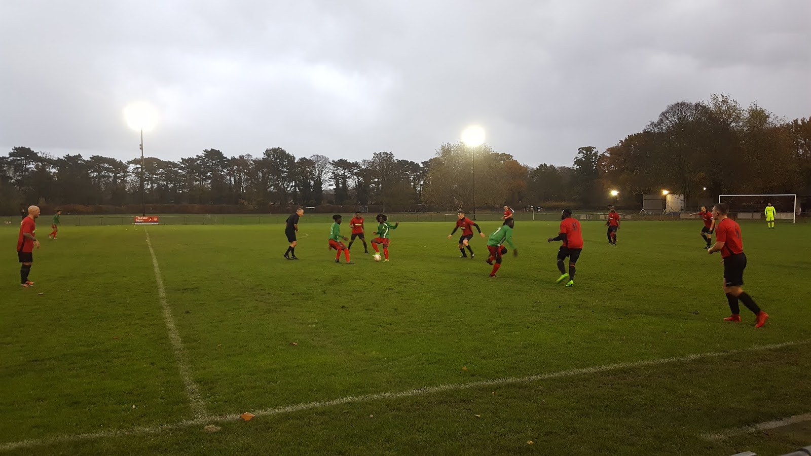 The Wormley Sports Ground is just under half hour walk away from Broxbourne train station, and a rather pleasant walk it is too, walking along the New River canal for the most part. The football ground is part of a large sports complex, including a playground, cricket field and several other football pitches. Spectators walk through a small car park, and then along a path to the side of a brick clubhouse, paying admission at a kiosk. Currently, it would be very easy to enter for free though, as the football ground is not enclosed from the surrounding complex, which can be freely accessed. Indeed, the official attendance for this game was 25 - there were considerably more than that present. There are excellent facilities in the clubhouse, with a bar in one section and a café in another. There is overhang along the front to offer shelter from rain, but it is set quite some way back from the pitch behind a goal and at an angle, meaning it is not ideally located to watch the game from. The changing rooms are housed in a separate brick building some way back from the corner flag. A neat hedgerow closely lines one length and behind the other goal, and straddling the half way line there is a small home made stand consisting of corrugated iron held up by scaffolding and painted in red and black, covering two steps. Either side are brick dugouts, with neat metal doors to prevent access when not in use. The remaining length, which backs onto the cricket field has just grass to stand on but is railed. It is a basic but quite charming ground, with some lovely autumnal colours amongst the surrounding trees, although presumably improvements will need to be made very soon - enclosing the ground and installing some seating are the most obvious. The club does not issue printed programmes, instead publishing an online one, but even that is woeful, consisting only of an introduction to the away club, and expected line-ups for today's game.